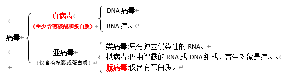 (3)按化学组成分类:真病毒(至少含有核酸和蛋白质)、亚病毒(仅含有核酸或蛋白质)