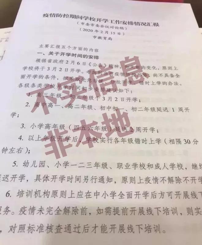 2月17日,一张市教育局的《疫情防控期间学校开学工作安排情况汇报》图片在多地朋友圈疯传。这份通报上写着:根据省政府2月6日《公告》精神,如无新的变化,原则上学校将于3月2日开学……拟采取先急后缓、分批开学、错时上学的办法……该文件流传上网后,引起极大关注。
