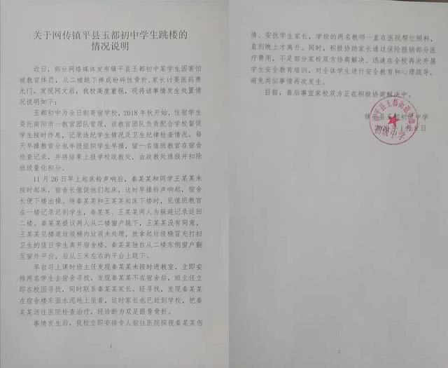近日,部分网络媒体发布镇平县玉都初中某学生因害怕被教官体罚,从二楼跳下摔成粉碎性骨折,家长讨要医药费无门。发现网文后,我校高度重视,现将该事情发生处置情况说明如下: